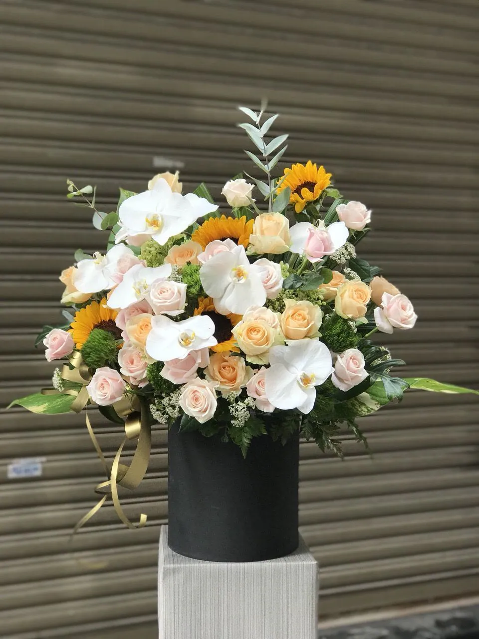 4 sunflowers with peach baby roses and cut orchid buds in box